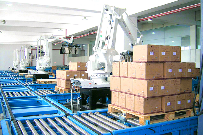自動化立體倉庫系統中大量使用碼垛機或機器人完成碼垛、拆垛的工作。是一種集成化的系統,它包括工業機器人、控制器、編程器、機器人手爪、自動拆/疊盤機、托盤輸送及定位設備和碼垛模式軟件。它還配置自動稱重、貼標簽和檢測及通訊系統,并與生產控制系統相連接,以形成一個完整的集成化包裝生產線。